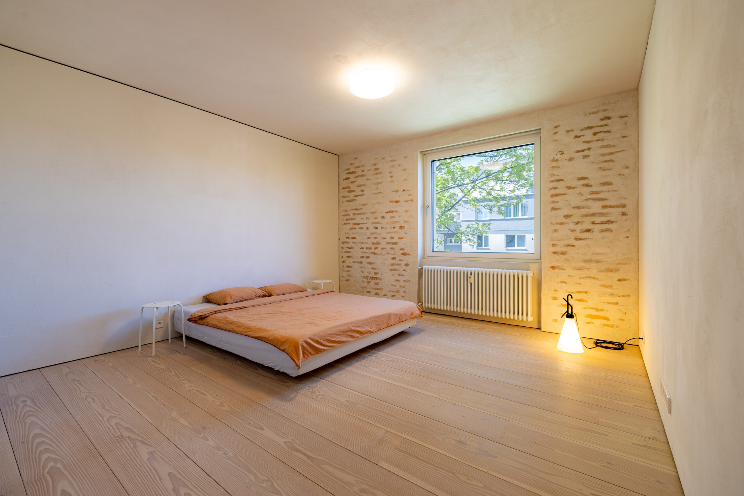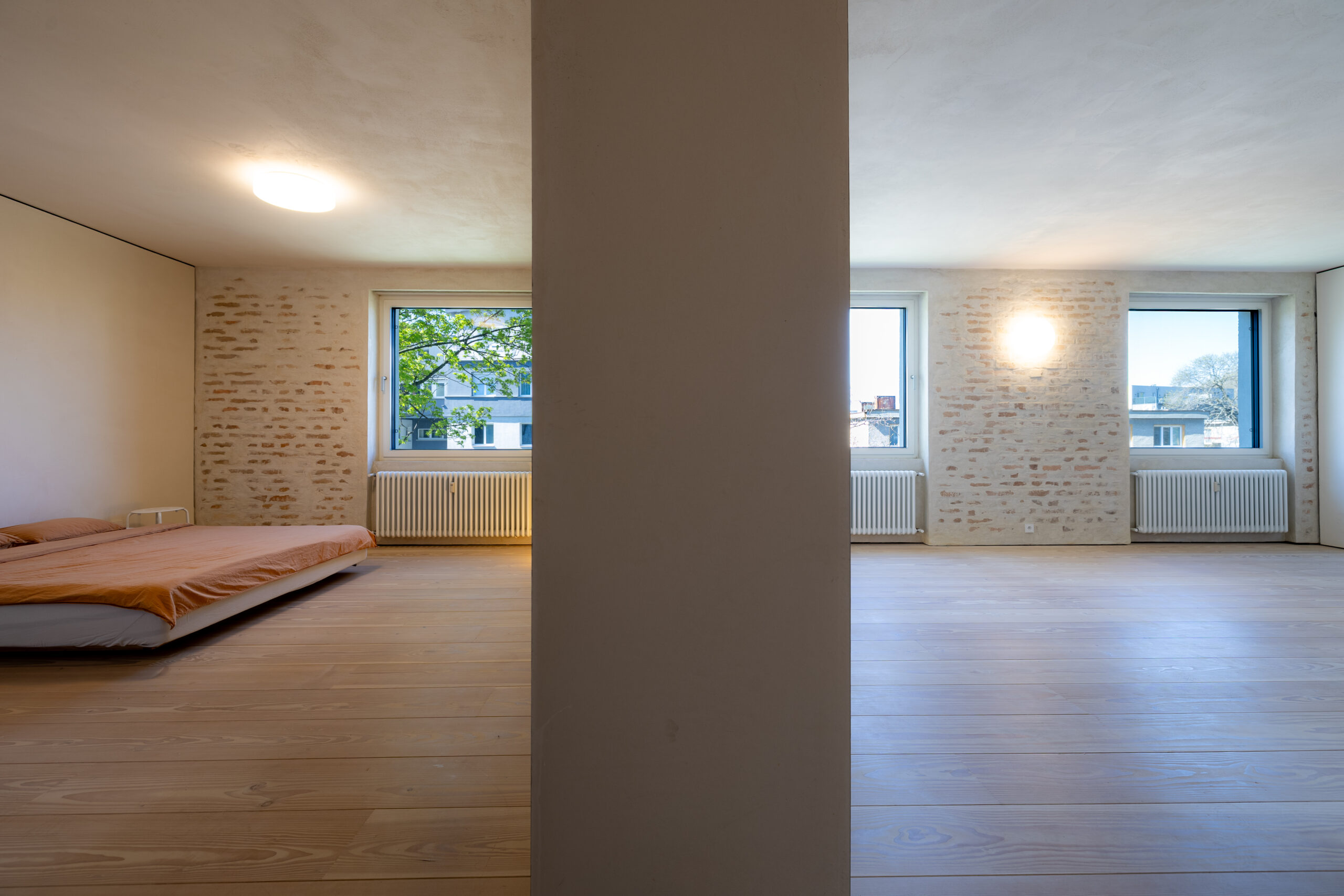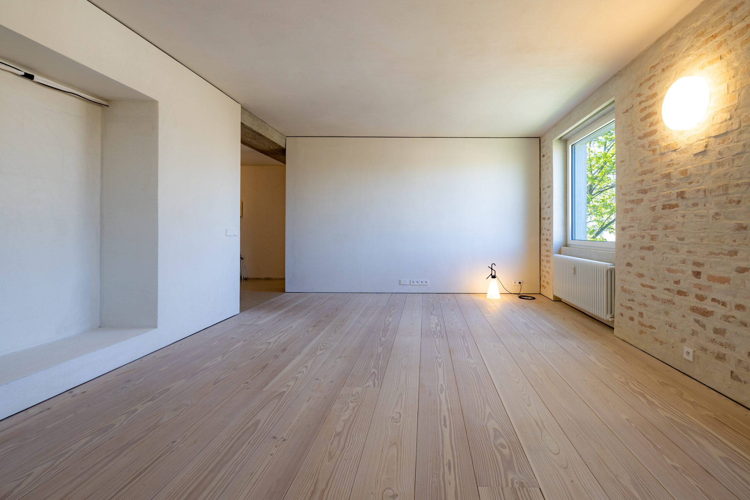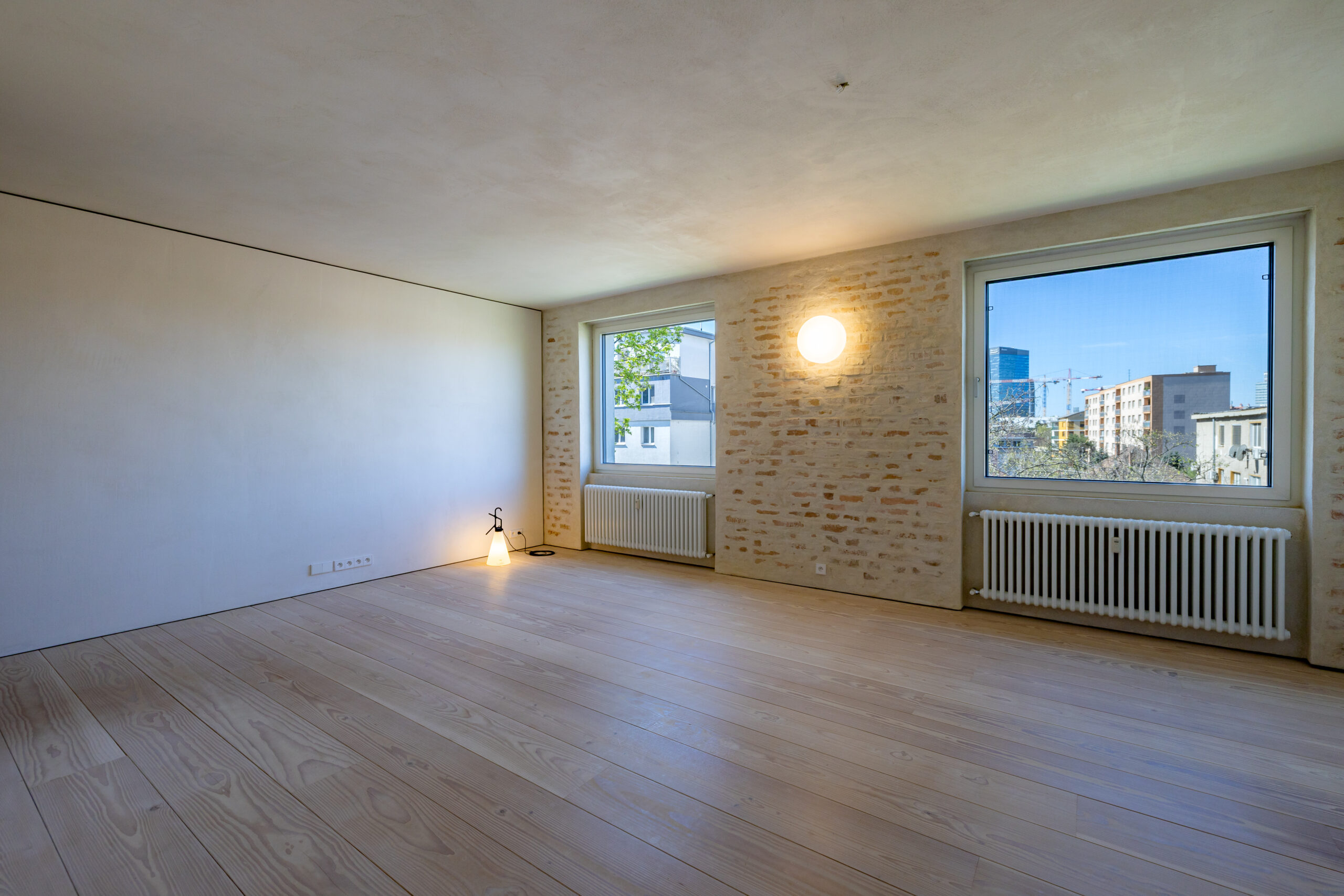 • Hra štruktúr: Očistené pôvodné tehlové murivo a priznané betónové konštrukcie tvoria nosnú estetiku priestoru. Tento surový základ je zjemnený masívnymi jaseňovými podlahami.