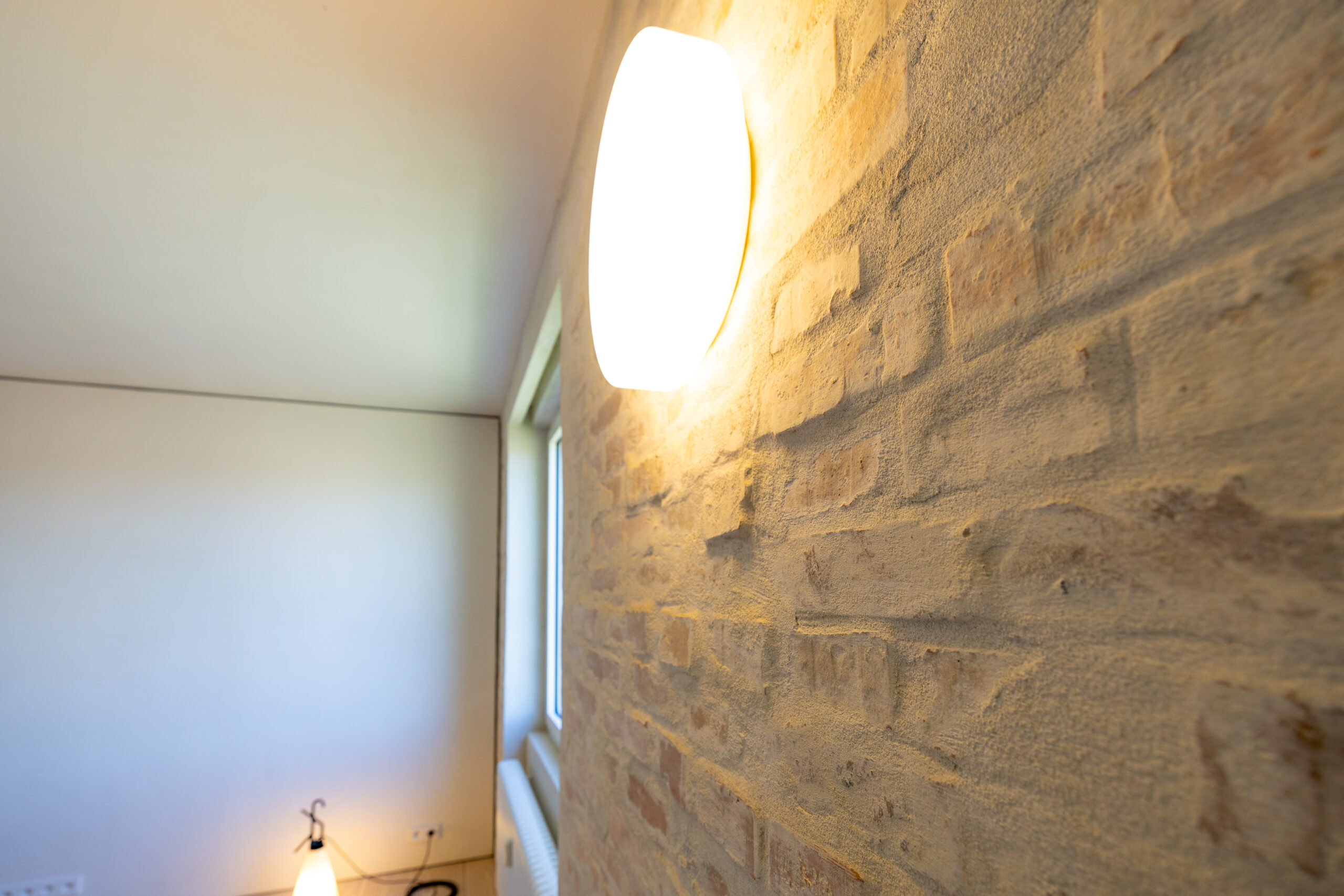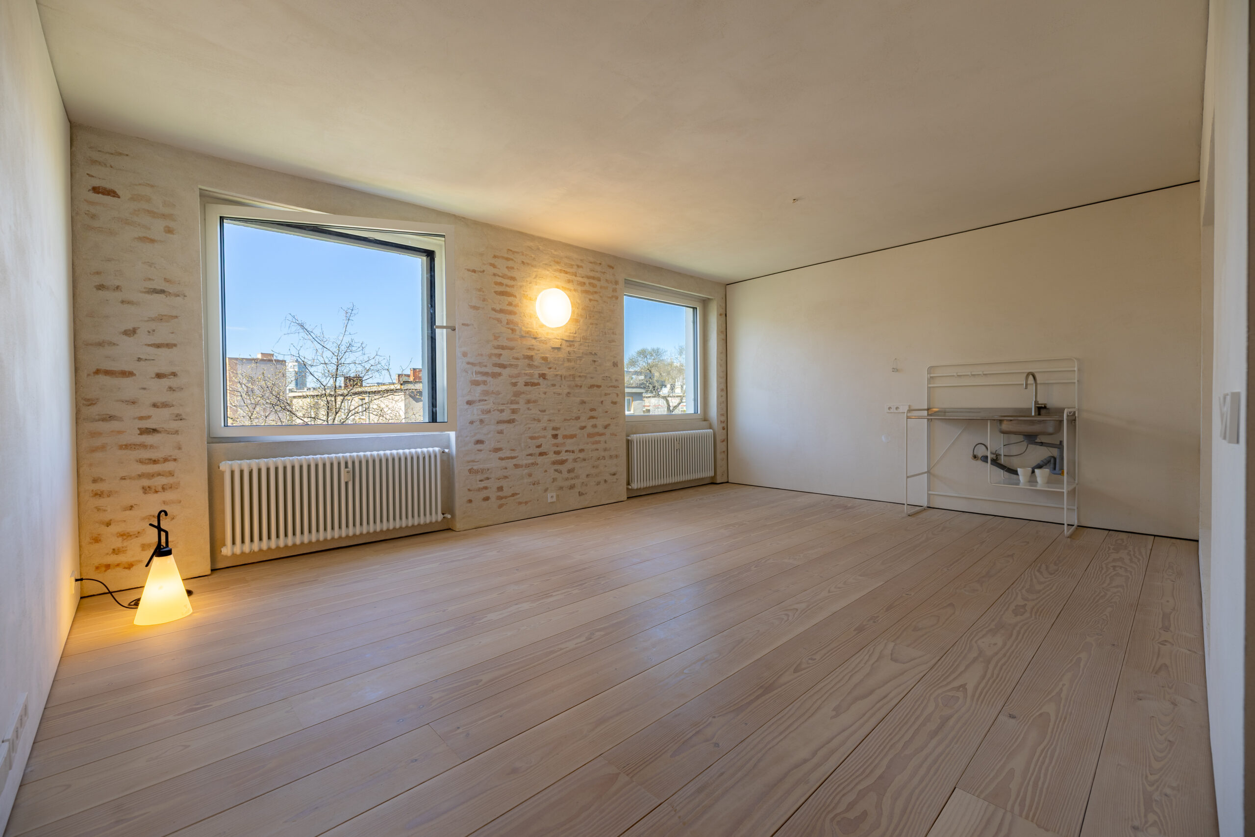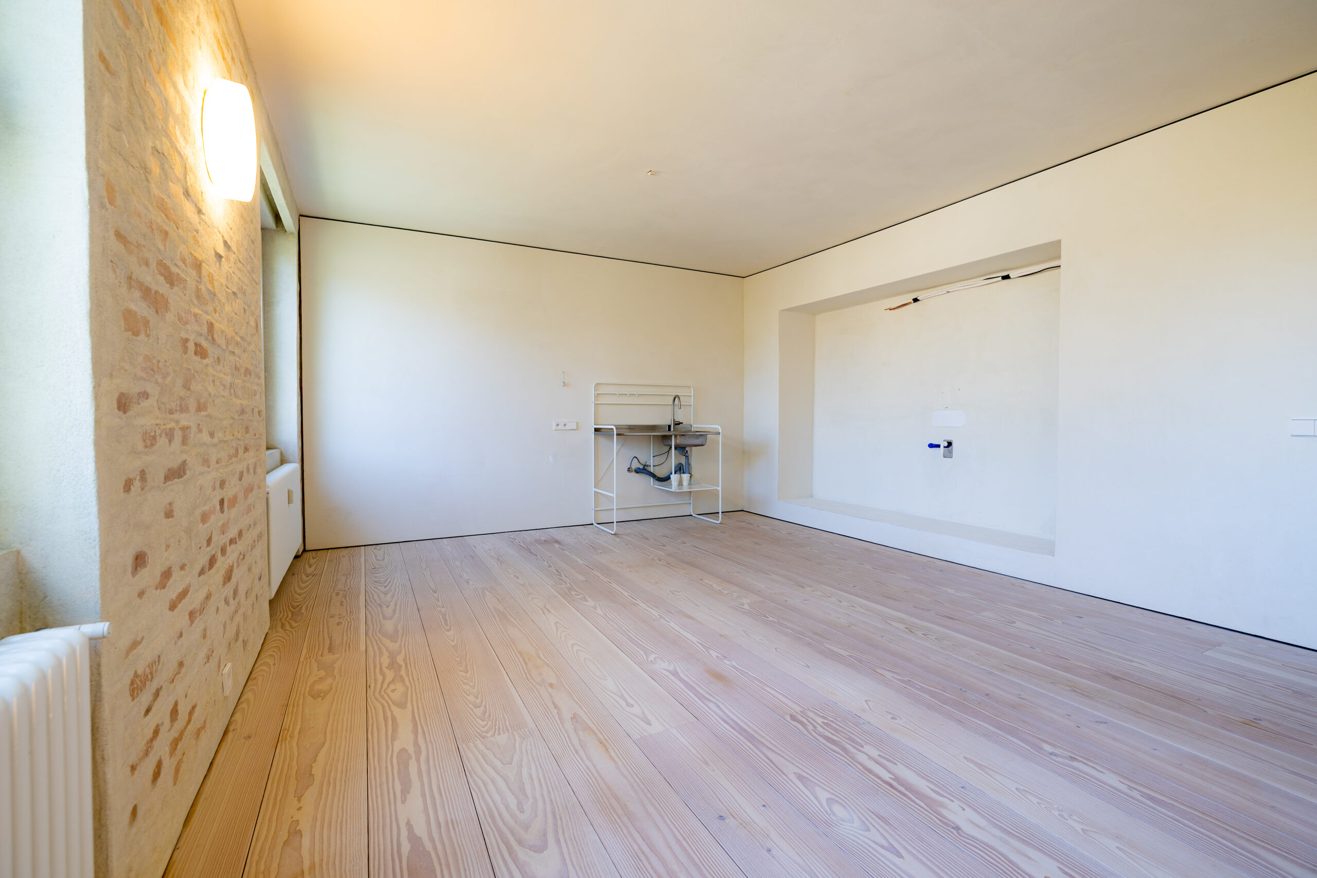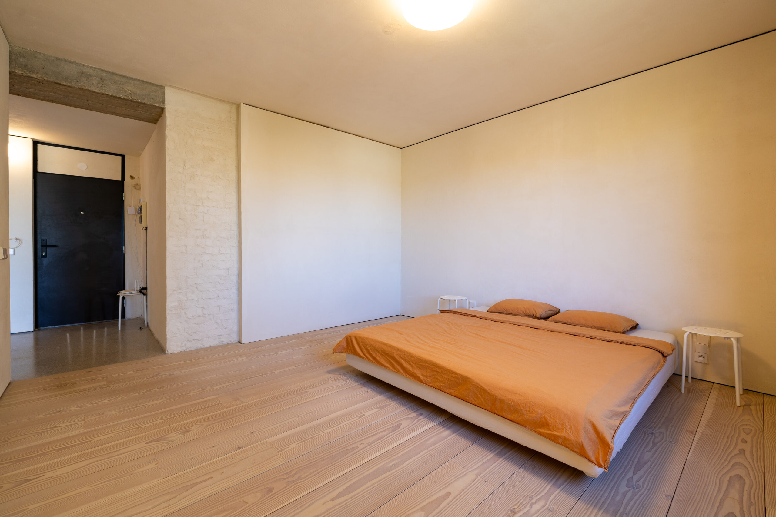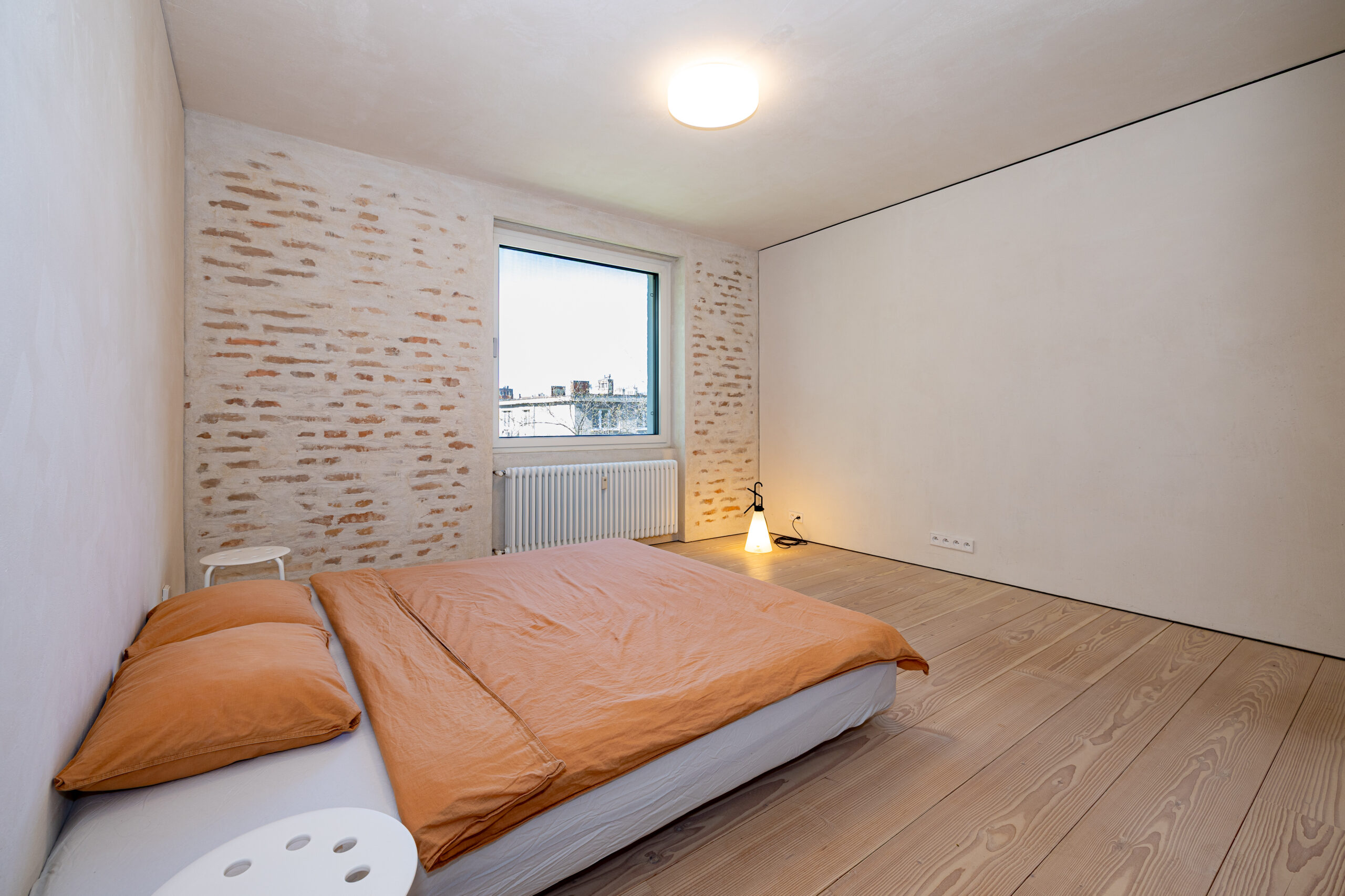 • Hra štruktúr: Očistené pôvodné tehlové murivo a priznané betónové konštrukcie tvoria nosnú estetiku priestoru. Tento surový základ je zjemnený masívnymi jaseňovými podlahami.