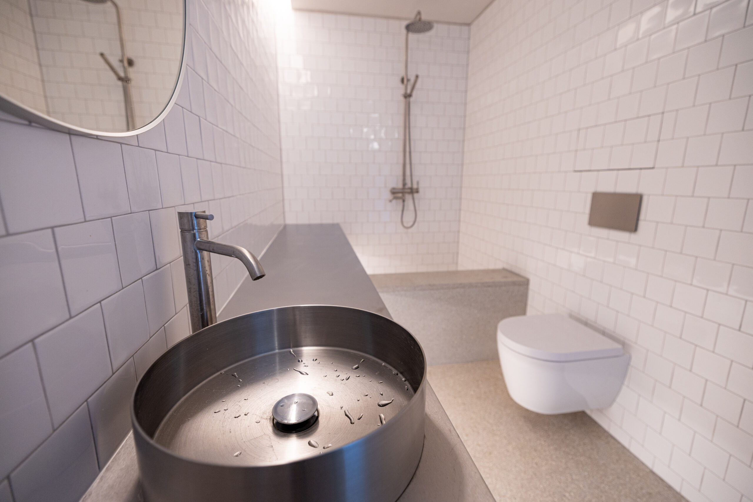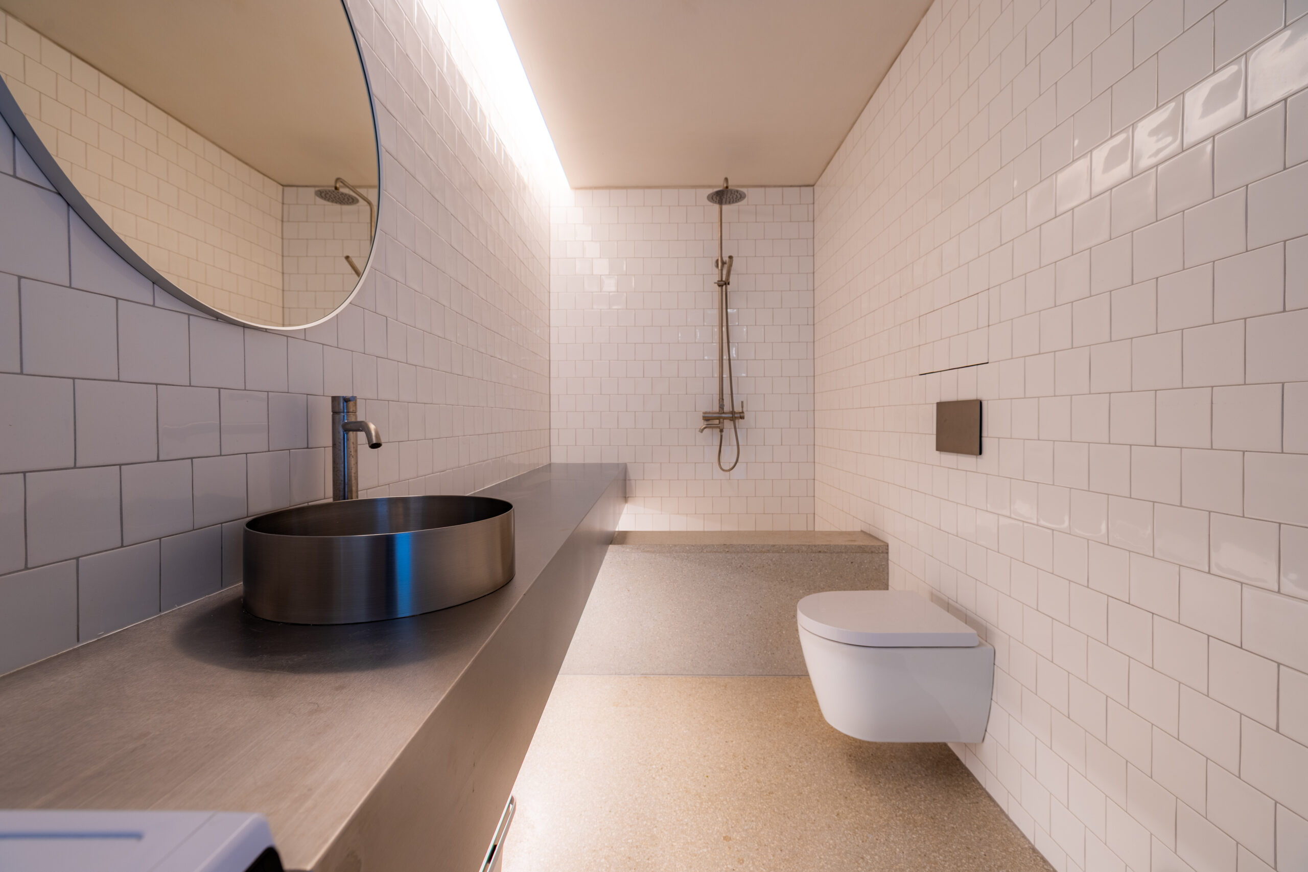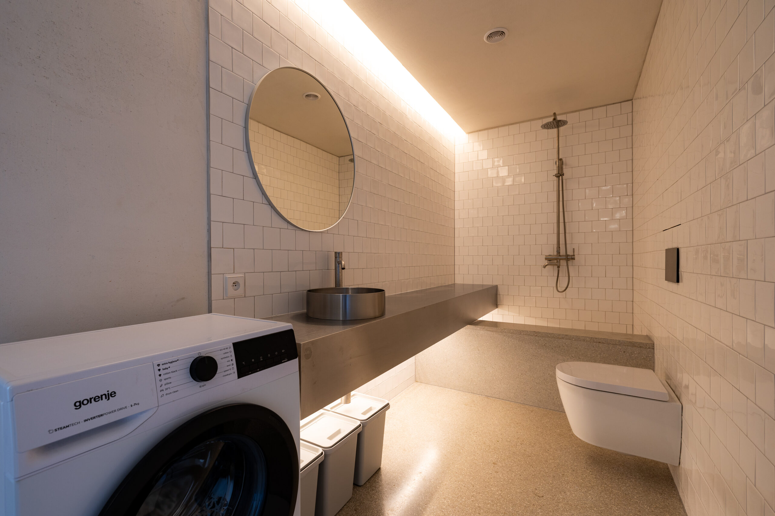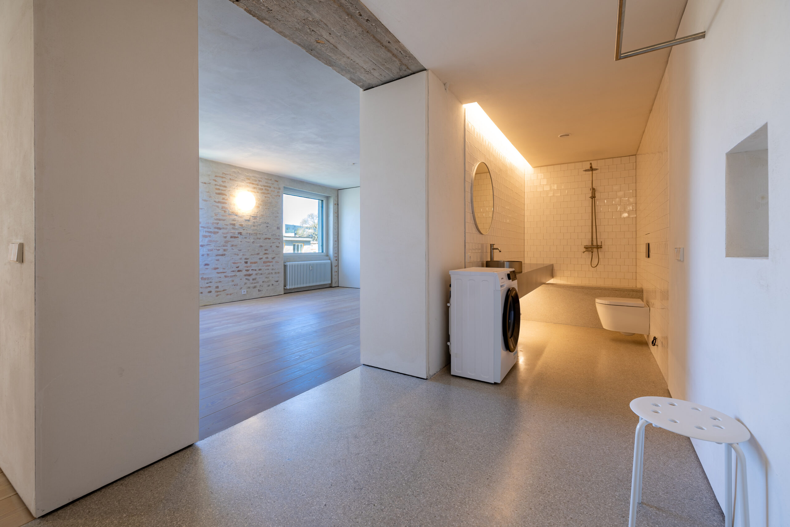 • Kúpeľňa ako solitér: Hygienické jadro s nerezovým, na mieru riešeným umývadlovým pultom, terazzovou podlahou a dizajnovou sanitou pôsobí ako vložený galerijný objekt.