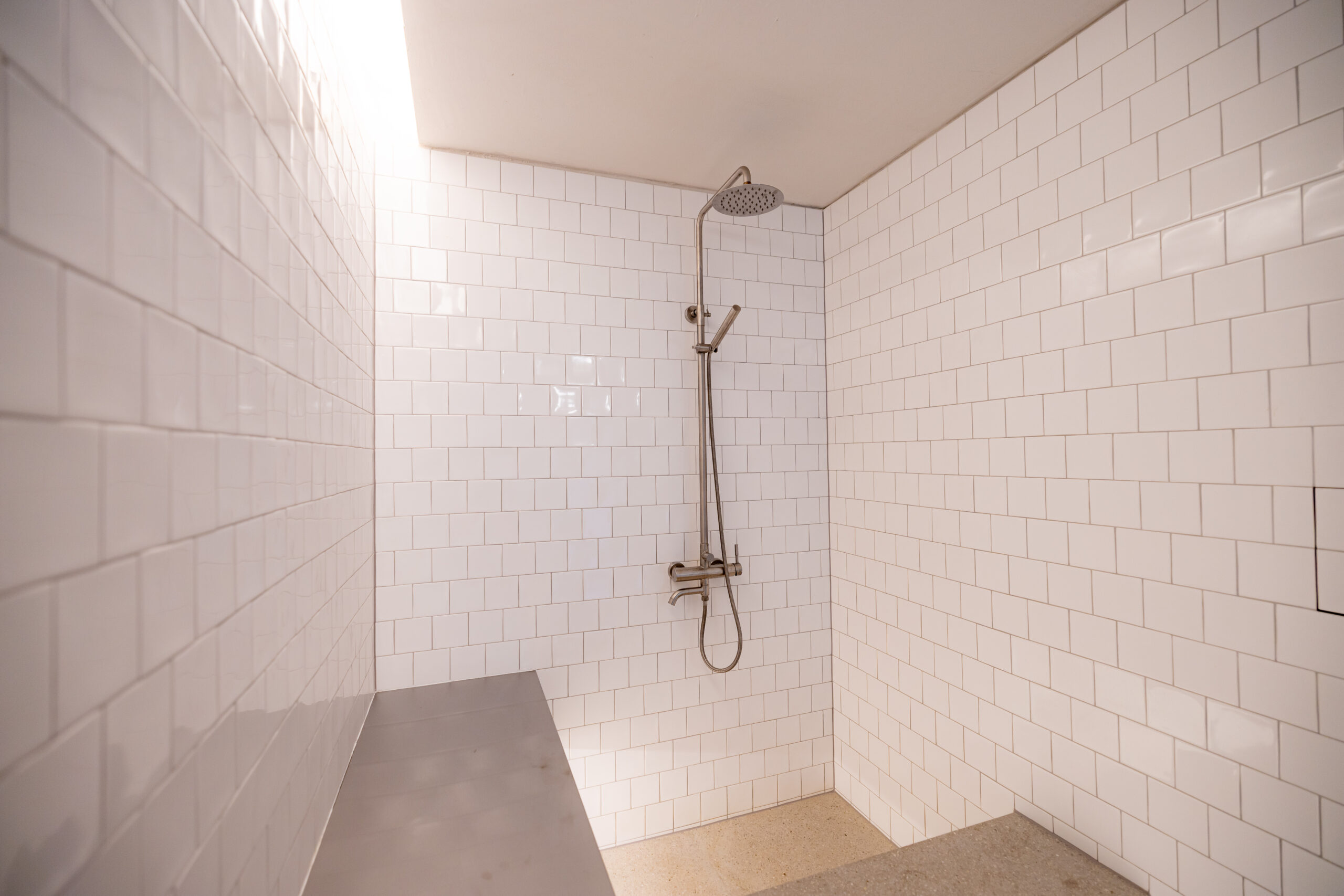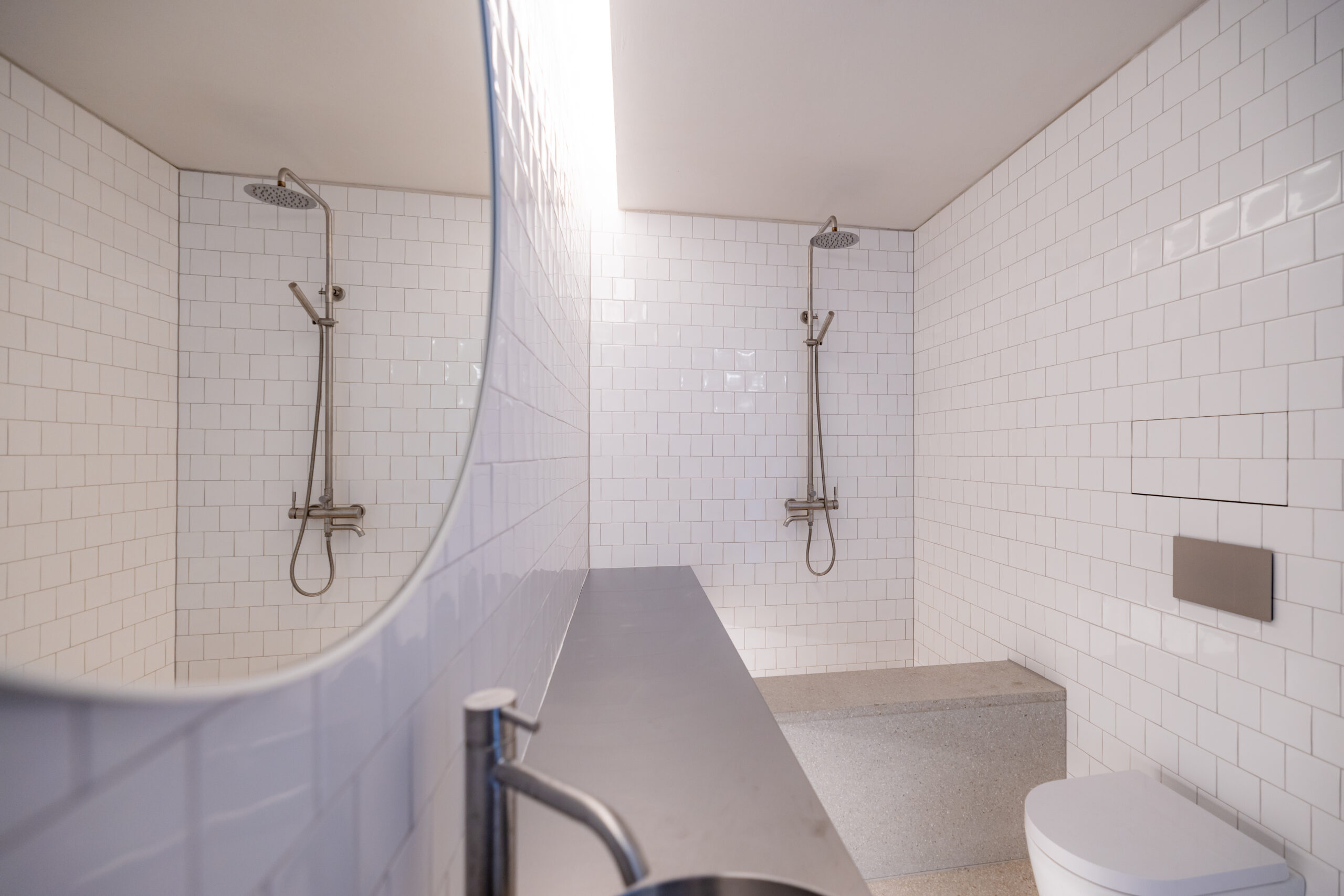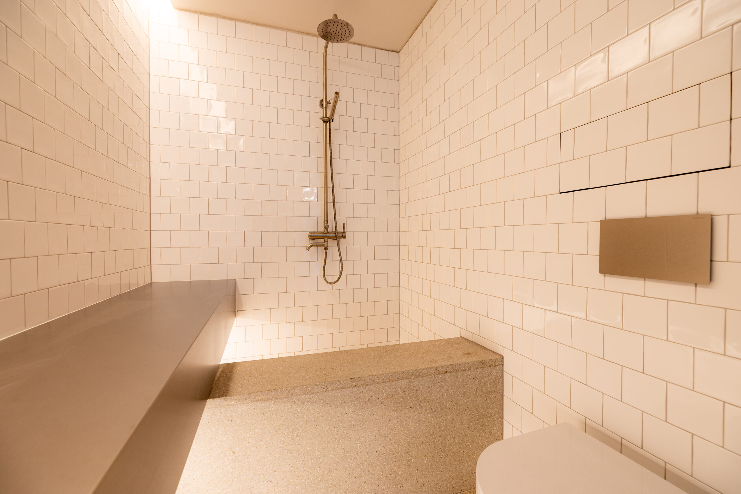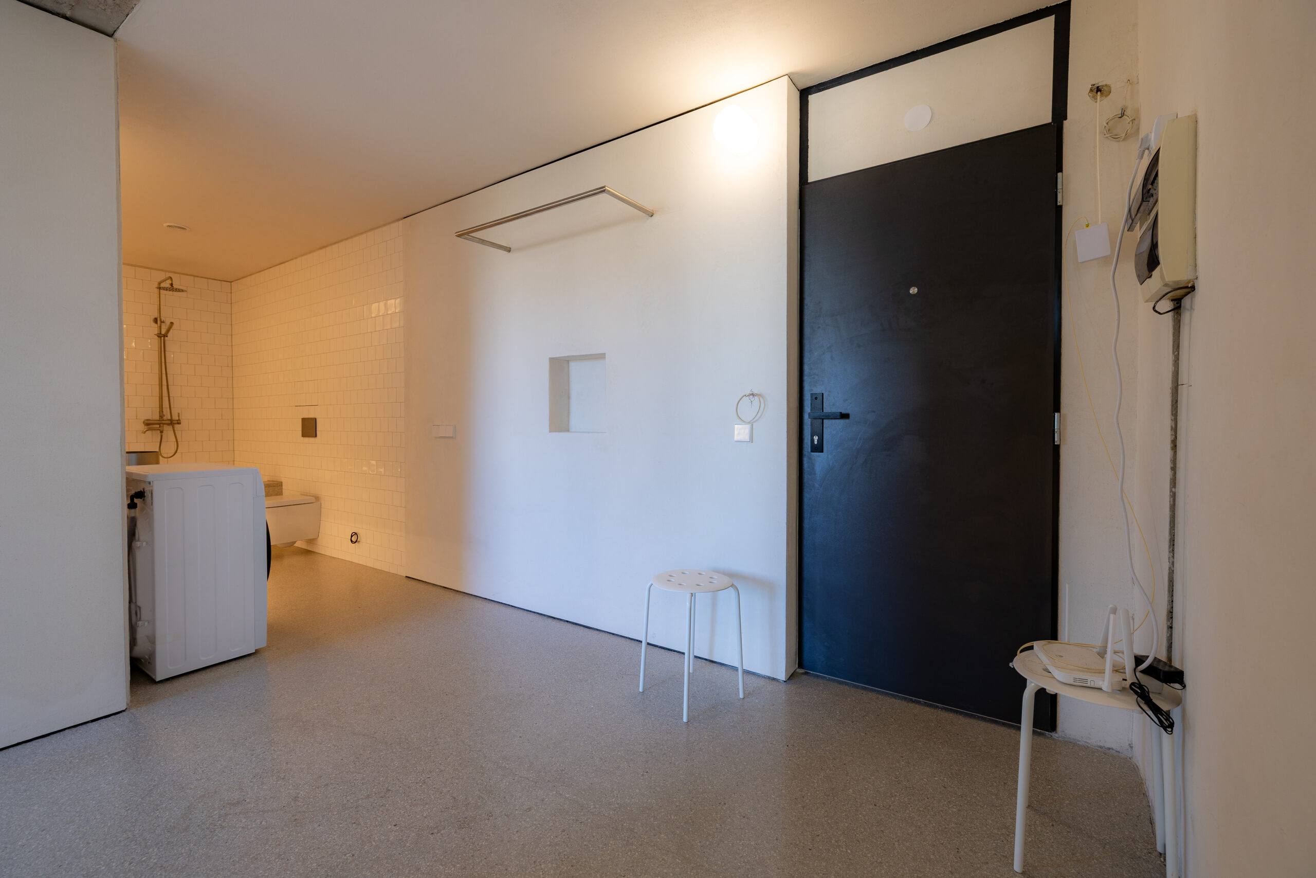 • Kúpeľňa ako solitér: Hygienické jadro s nerezovým, na mieru riešeným umývadlovým pultom, terazzovou podlahou a dizajnovou sanitou pôsobí ako vložený galerijný objekt.