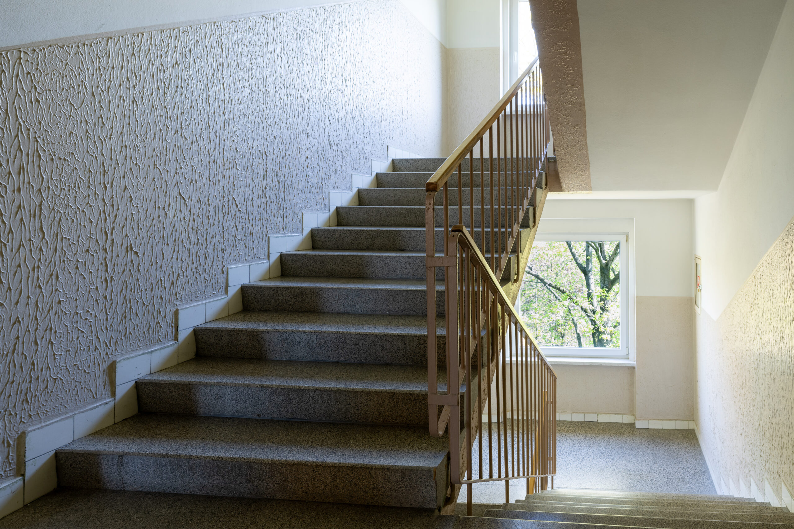 Komunikačné a hygienické zóny: Priamo na mieste liate, monolitické terazzo (hrúbka 27 mm), aplikované na identickej akustickej a podkladovej skladbe (50 mm poter + 40 mm Nobasil).