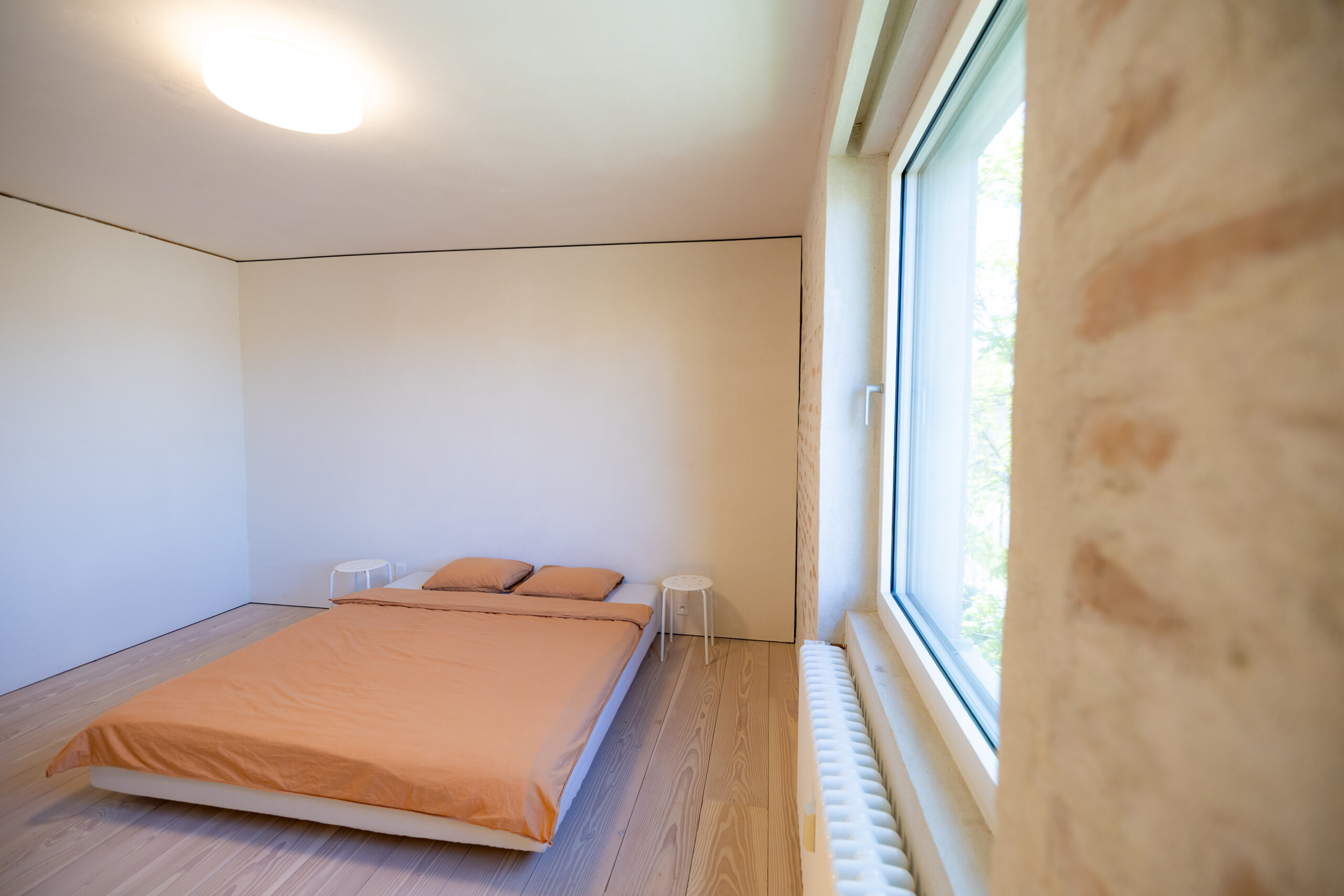Vykurovacie telesá: Článkové oceľové radiátory Isan Atol v industriálnom dizajne (typ 3 v dennej zóne, typ 4 v spálni).