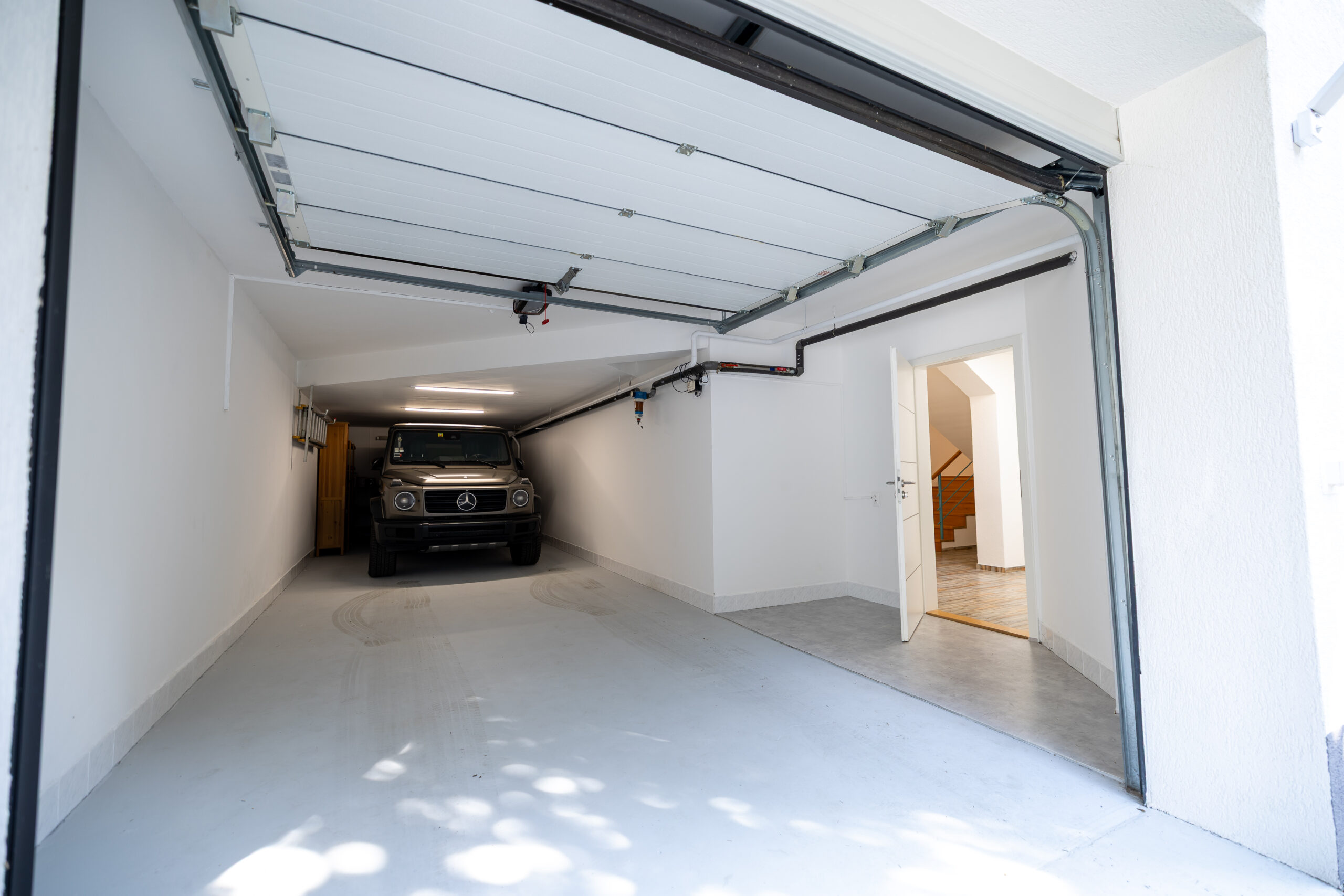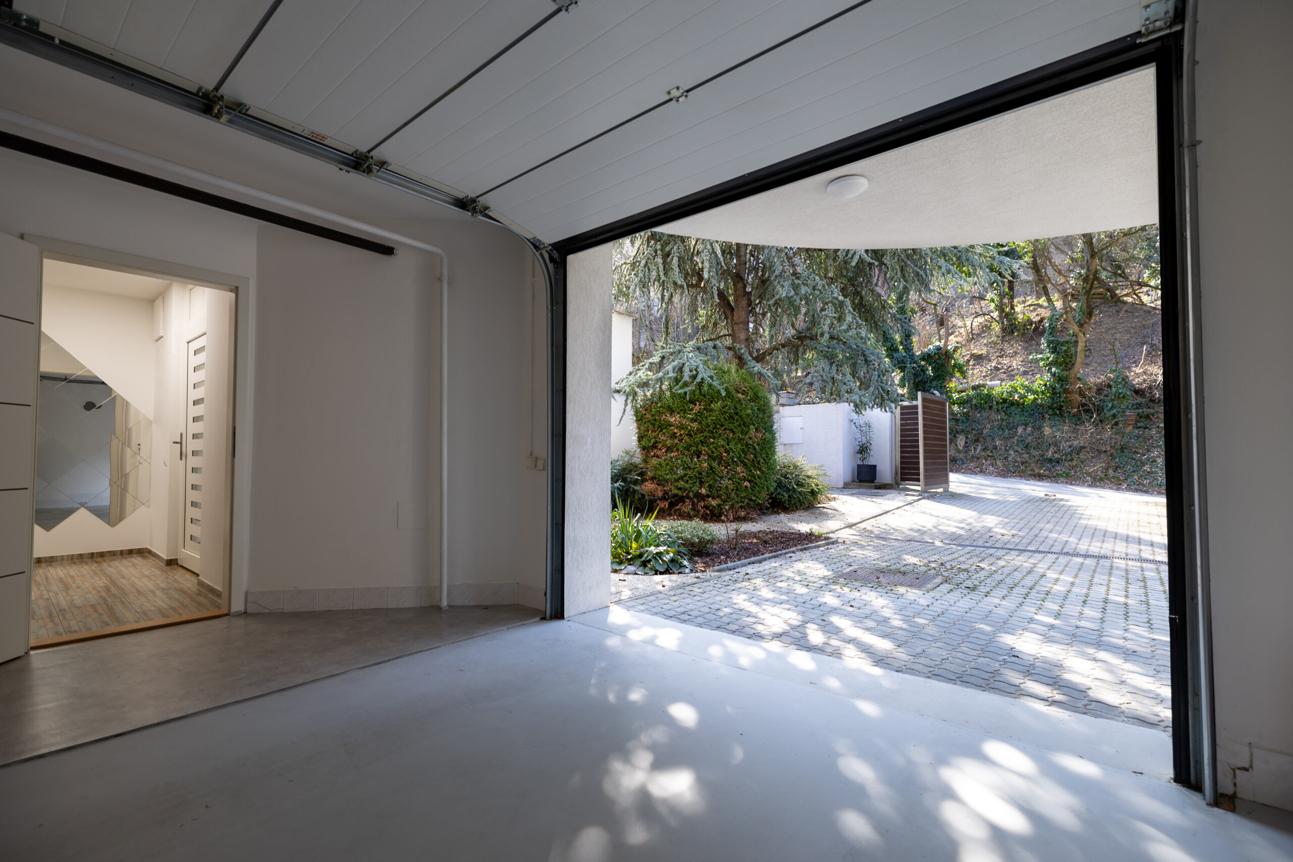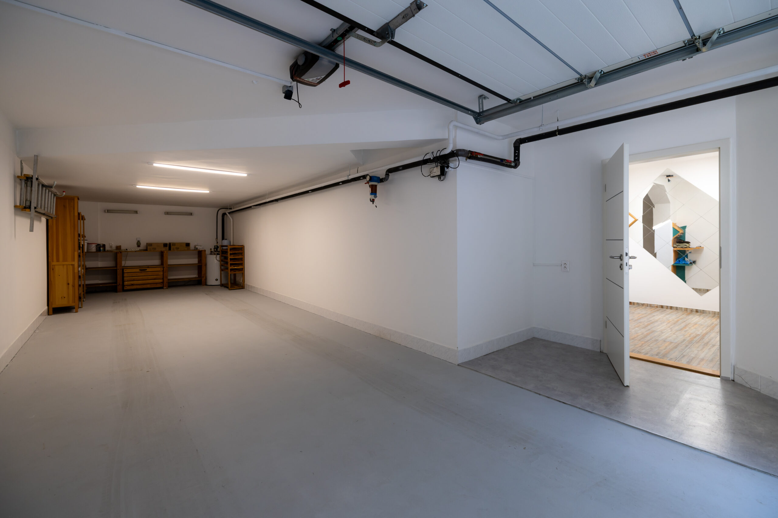 Vstupná úroveň dedikovaná logistike a regenerácii. Obsahuje privátnu wellness zónu so saunou a rozsiahle skladové kapacity (ideálne pre vínotéku či umelecký archív). Súčasťou je nadštandardná garáž (42 m²) s dĺžkou 11,6 m, schopná poňať dve veľkoformátové limuzíny v tandemovom usporiadaní a ďalšie 3 pakovacie miesta na pozemku.