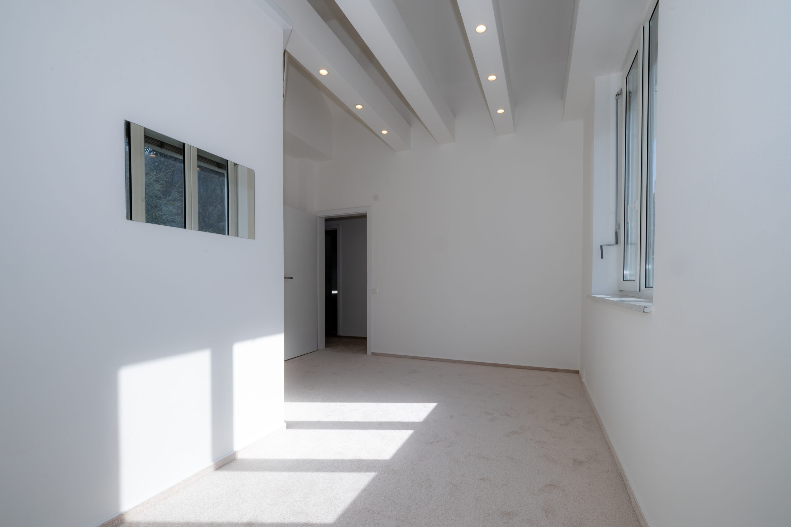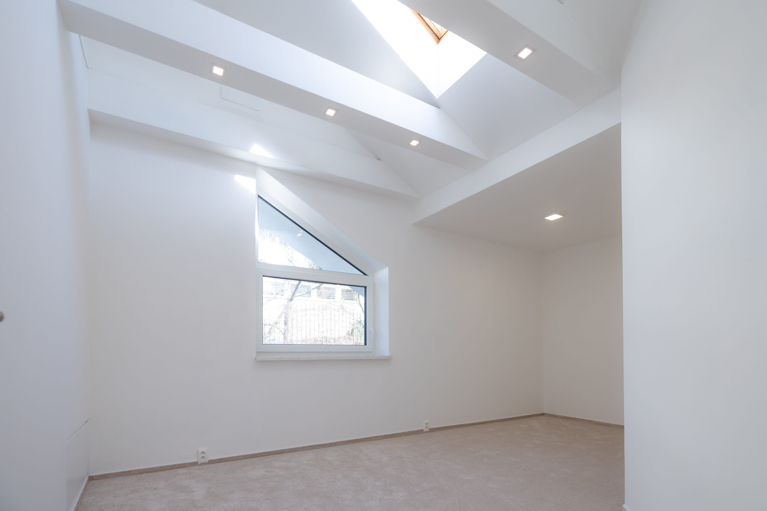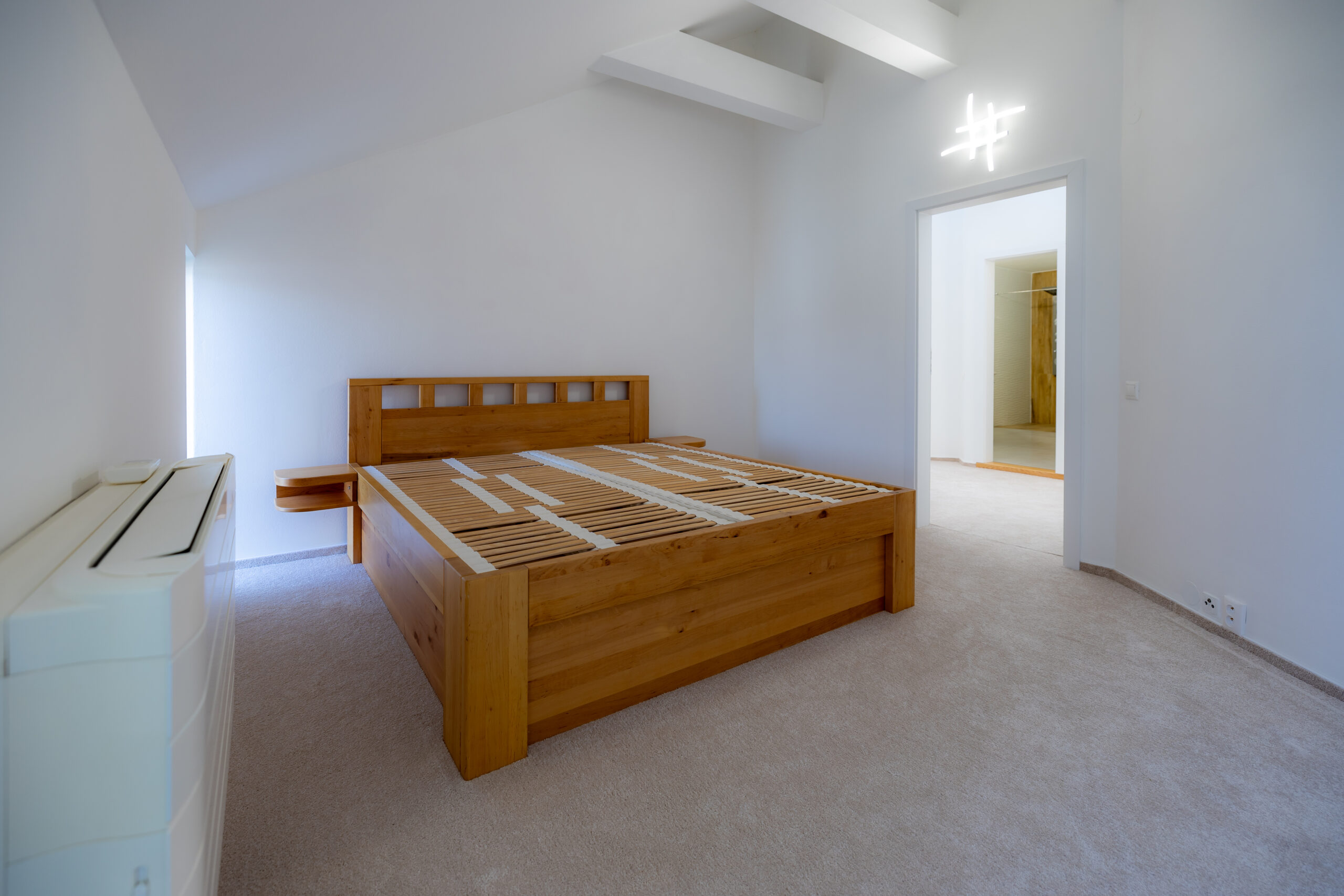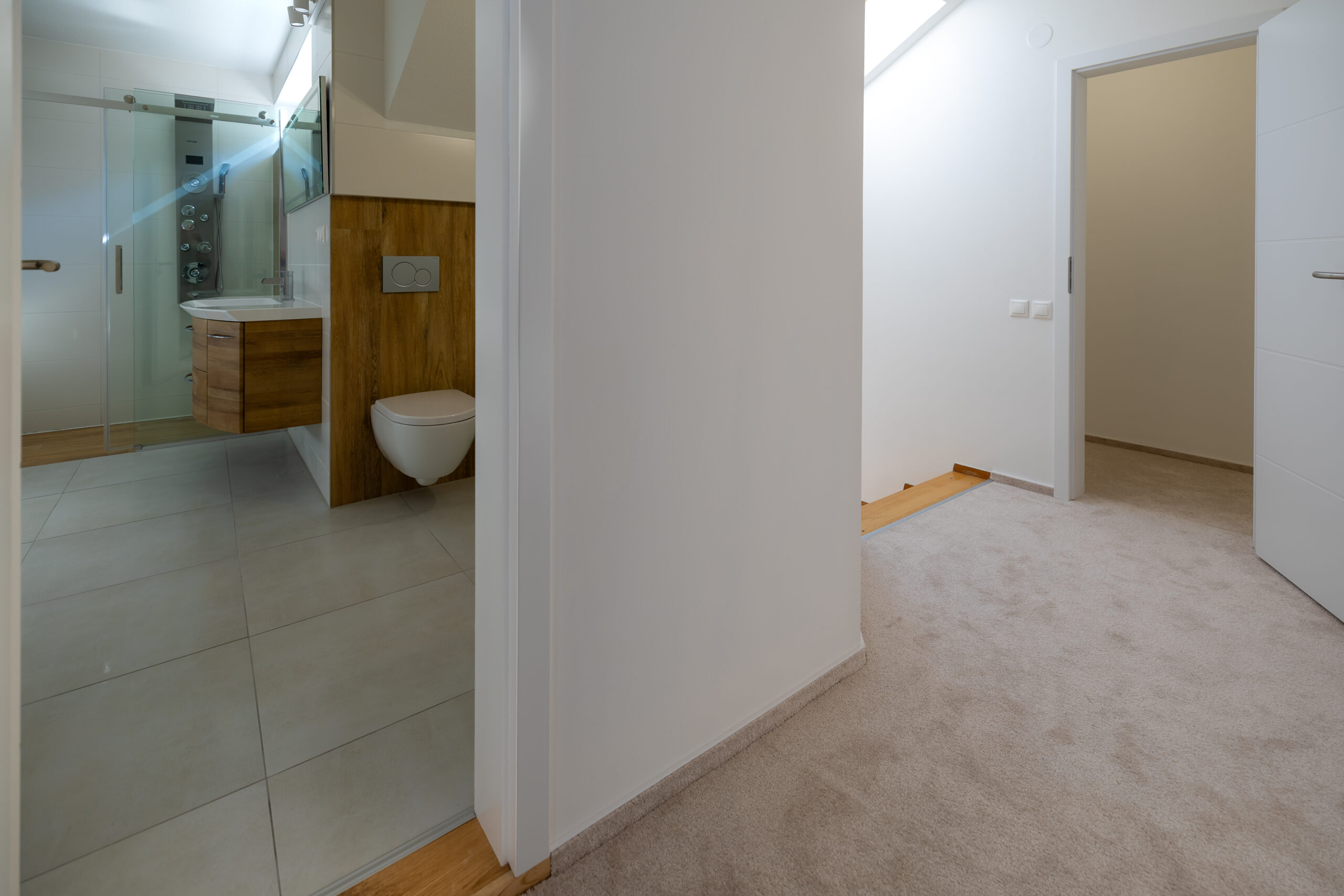 Najvyššie podlažie je koncipované ako privátna svätyňa majiteľov. Primary bedroom s en-suite kúpeľňou a šatníkom ponúka vďaka galérii pocit nekonečného priestoru, pričom si zachováva absolútnu intimitu a výhľady do zelene.