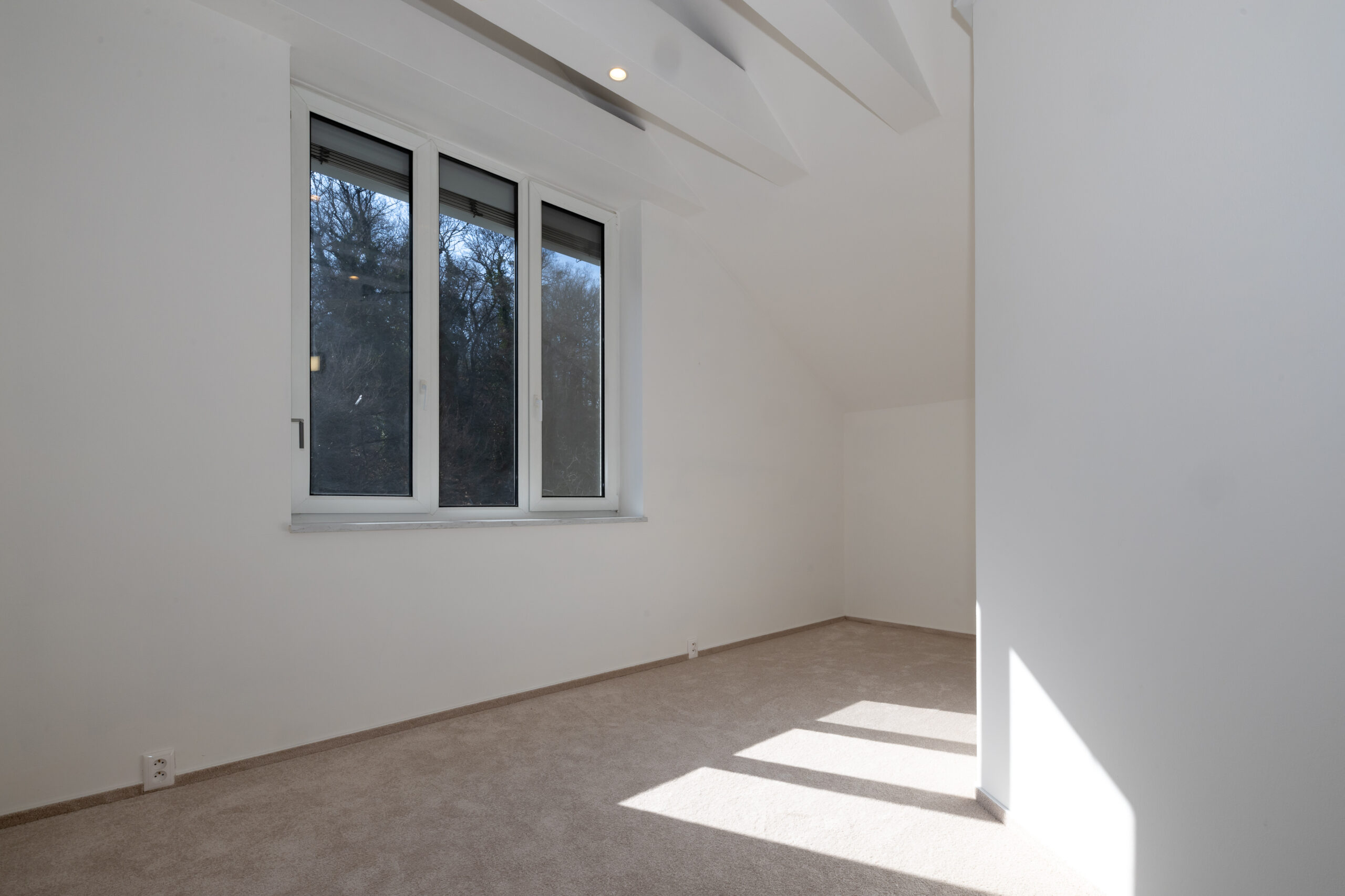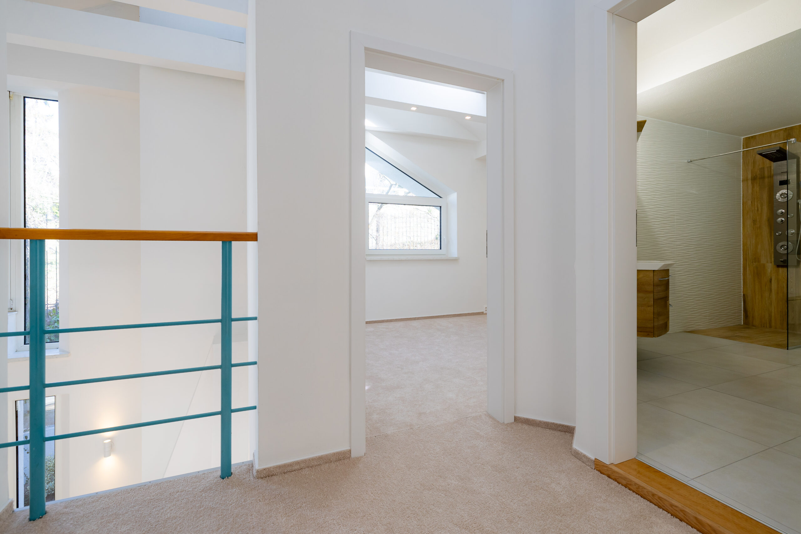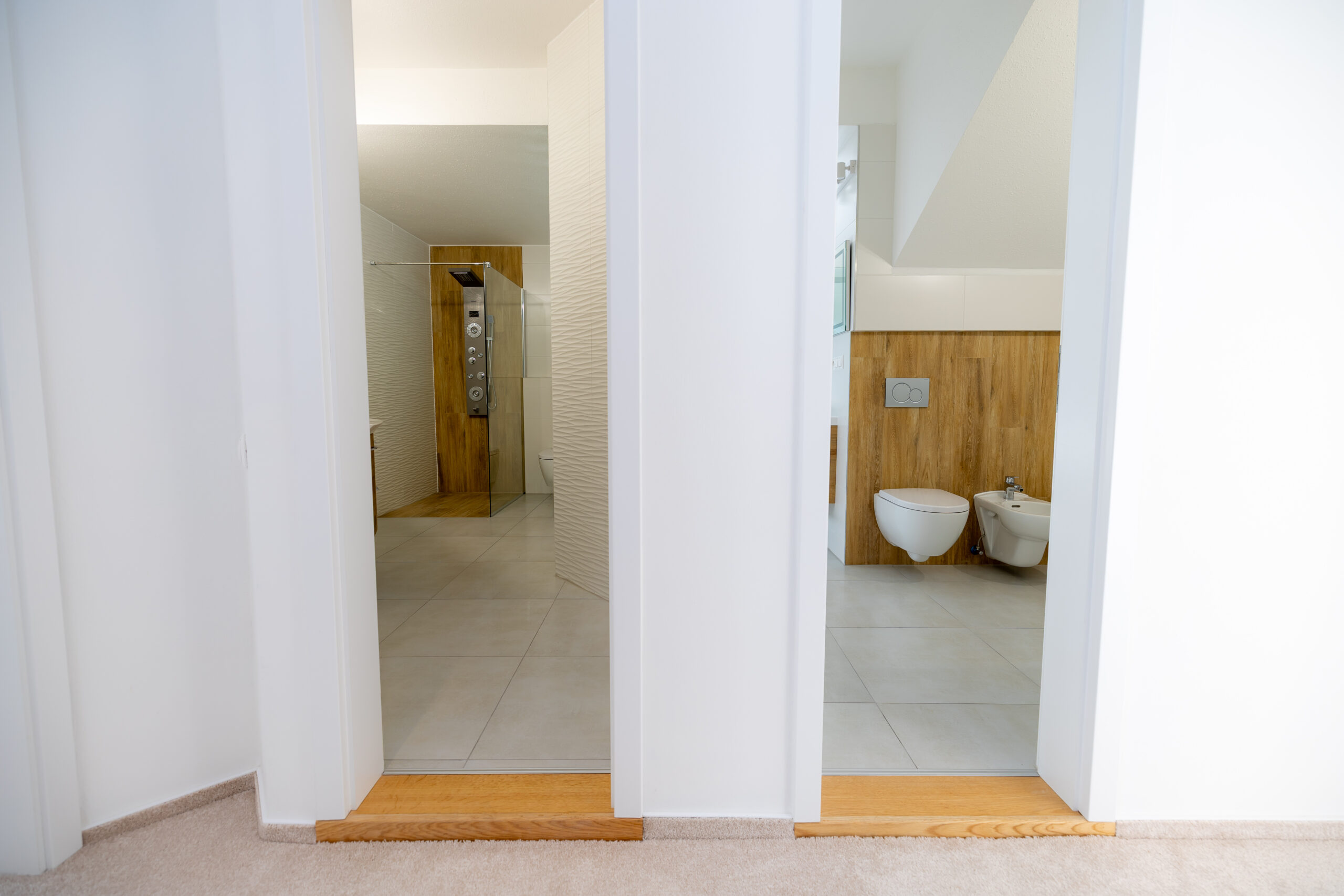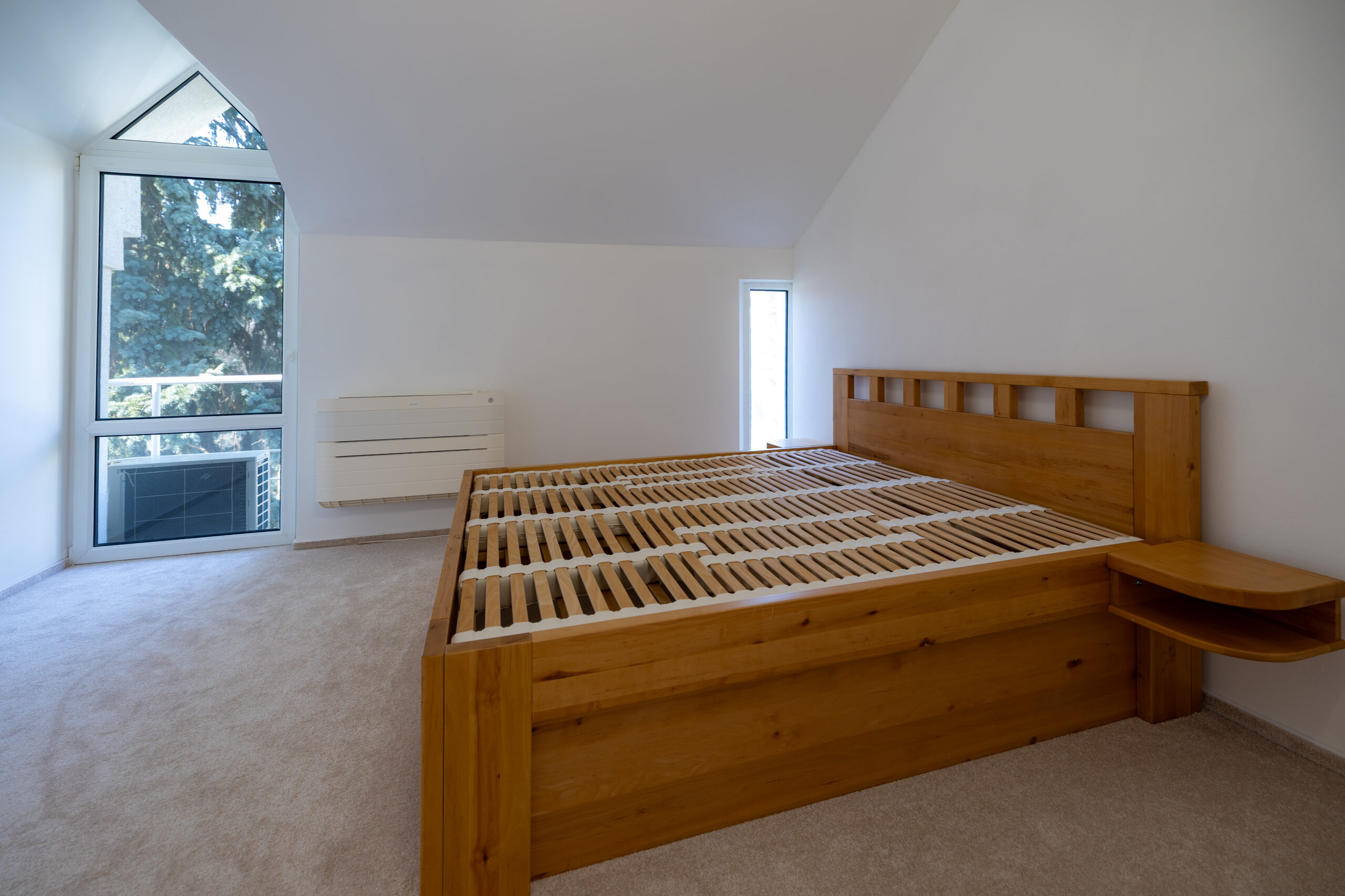 Najvyššie podlažie je koncipované ako privátna svätyňa majiteľov. Primary bedroom s en-suite kúpeľňou a šatníkom ponúka vďaka galérii pocit nekonečného priestoru, pričom si zachováva absolútnu intimitu a výhľady do zelene.